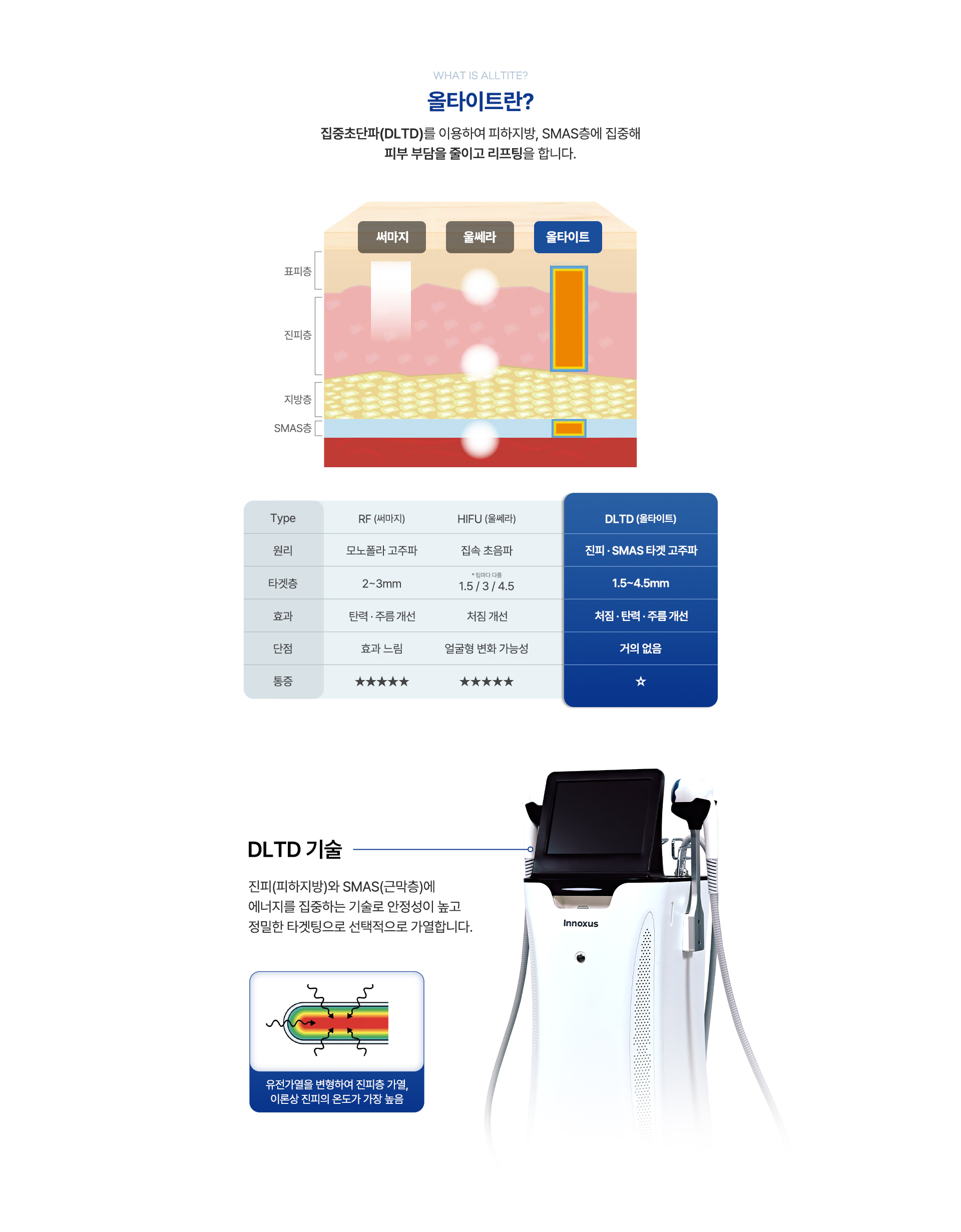| Type | RF(써마지) | HIFU(울쎄라) | DLTD(올타이트) |
