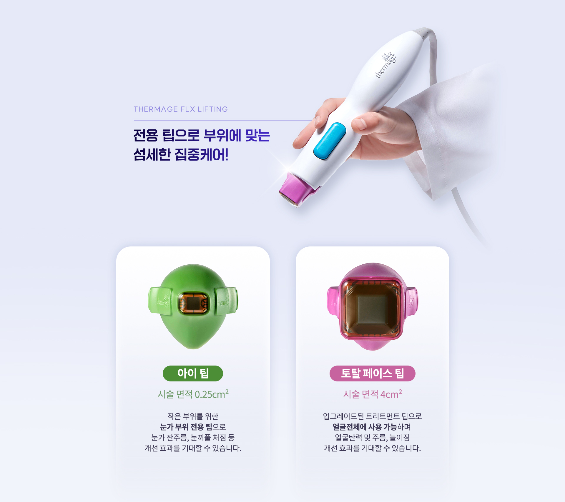 4세대 써마지FLX는 고주파 에너지를 정교하게 피부 진피층에 방사하여, 콜라겐의 재생 및 수축을 통해